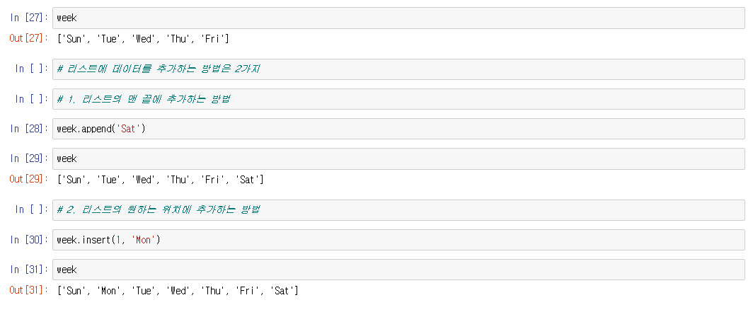 그러므로 insert( 인덱스, 값 ) 함수를 이용해서 week 라는 리스트에 insert( 1, 'Mon' )를 해주면 된다