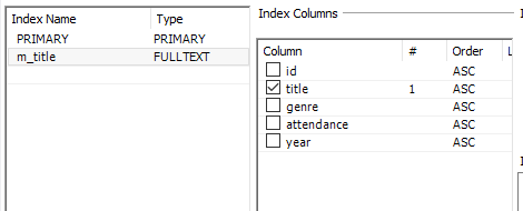 그러므로 검색기능을 사용할때는 검색 속도를 높이기 위해 검색 하려는 컬럼에 대해 풀텍스트(fulltext) 인덱스를 꼭 해준다