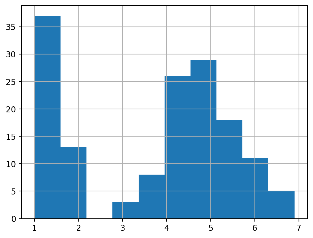 plt.hist(data=df, x= 'petal_length', bins= 10, rwidth= 0.8)