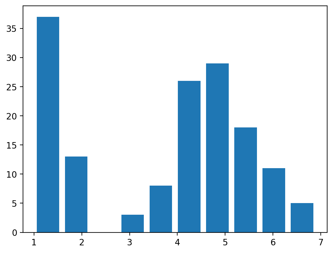 plt.hist(data=df, x= 'petal_length', bins= 10, rwidth= 0.8)