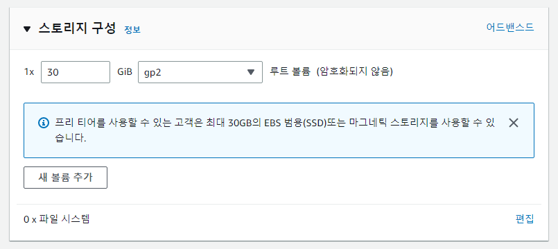 네트워크 정보는 그냥 두고 스토리지 구성은 프리티어 최대 30GB이므로 30으로 설정