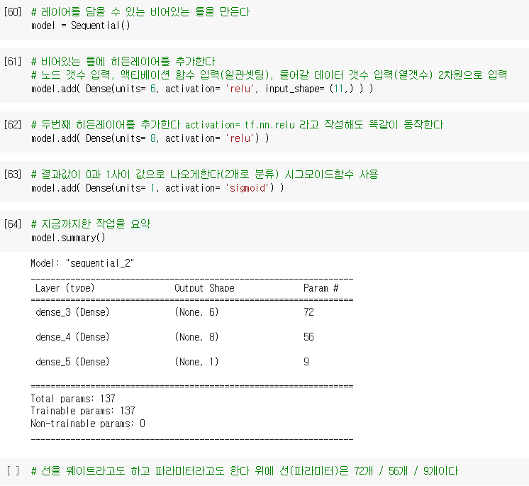 Sequential()로 비어있는 틀을 만들어 add 함수로 히든 레이어를 추가하고 아웃풋 레이어도 추가한다