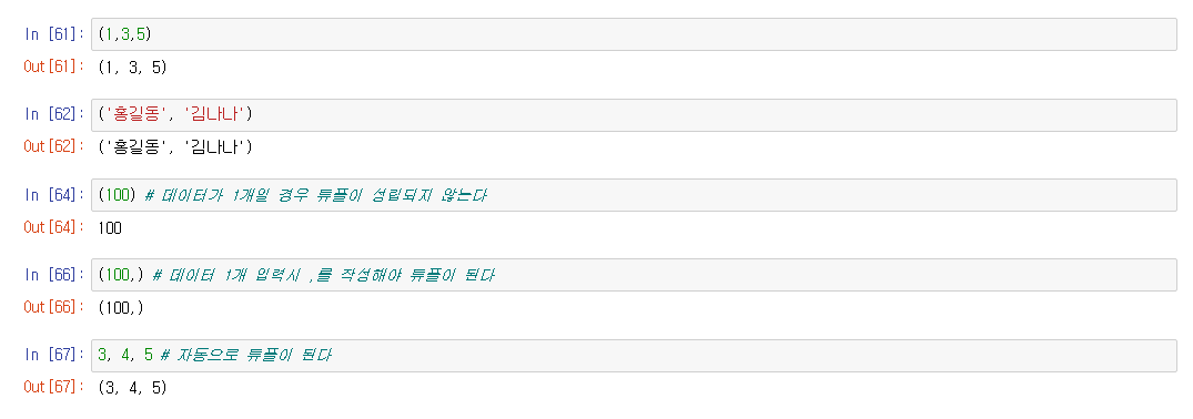 ※ 튜플을 만들때 주의할 점 : 튜플 안에 데이터가 1개일 경우 튜플이 성립되지 않는다