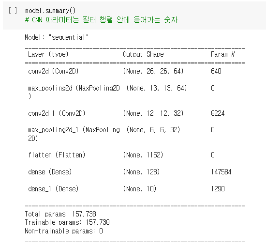 model.summary() 해서 확인해보면 CNN 파라미터는 필터 행렬 안에 들어가는 숫자이다