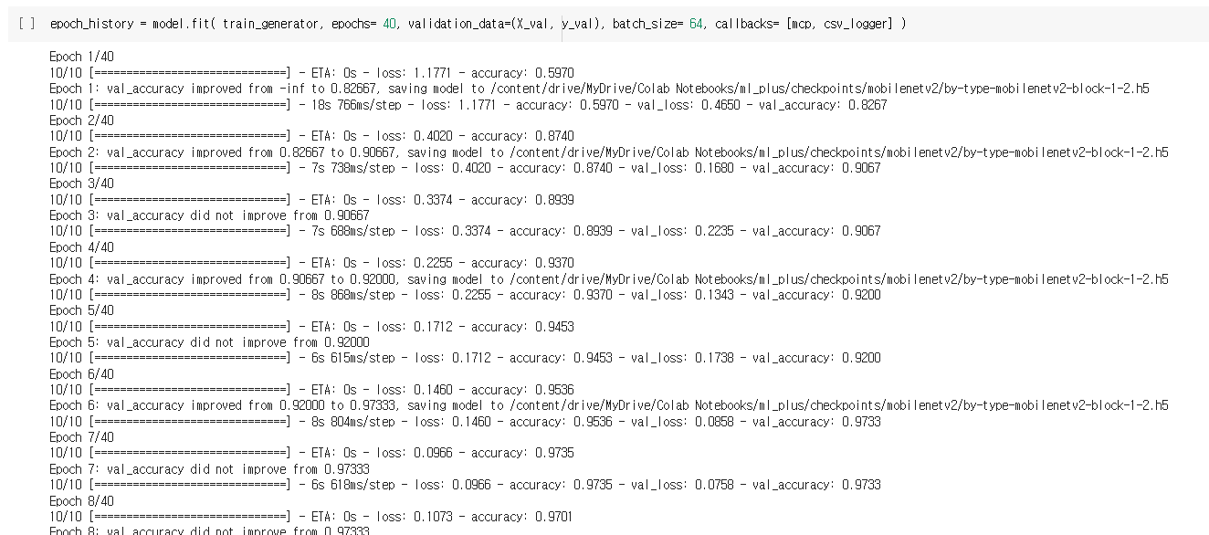 epoch_history = model.fit( train_generator, epochs= 40, validation_data=(X_val, y_val), batch_size= 64, callbacks= [mcp, csv_logger] )