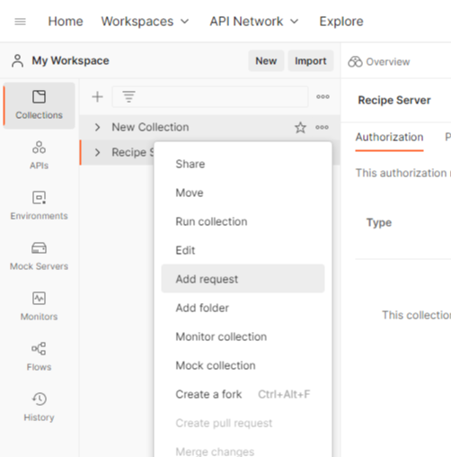 새로운 Collecrion을 생성하고 우측에 Add request를 클릭해서 사용한다