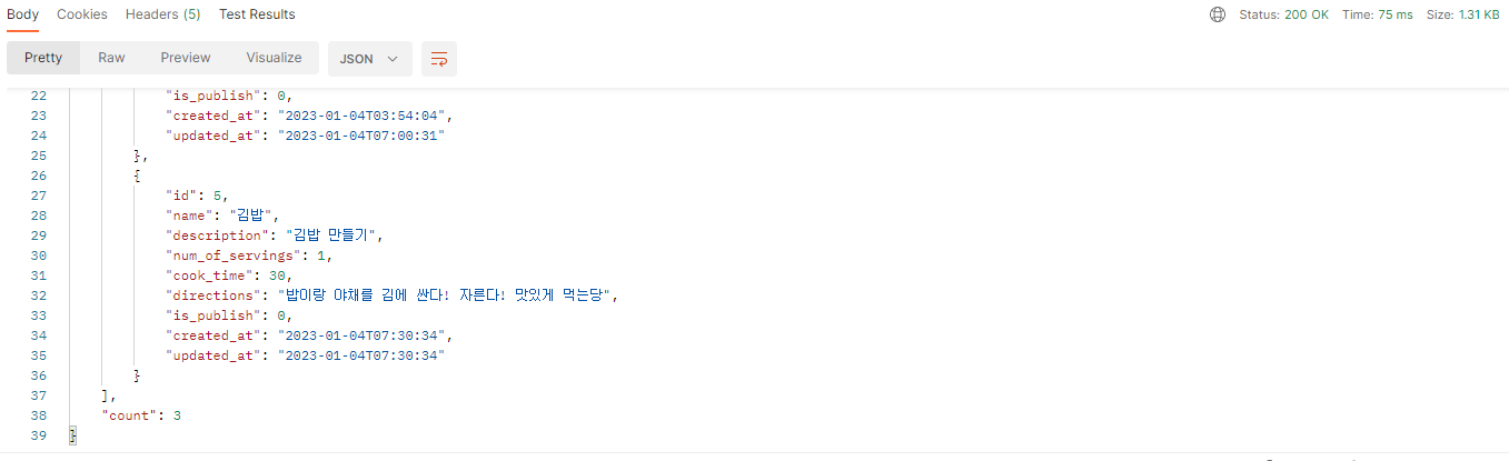 포스트맨에서 Send를 클릭해 하단의 정보를 확인하고 상태코드가 200 OK 됐는지 확인한다