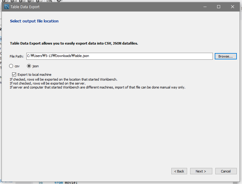 ※ 가져올 테이블의 우측 클릭 후 Table Data Export Wizard 선택 후 제이슨 파일로 저장