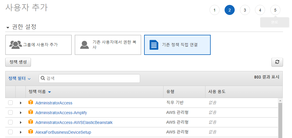 기존 정책 직접 연결 선택 후 사용할 정책을 선택해준다