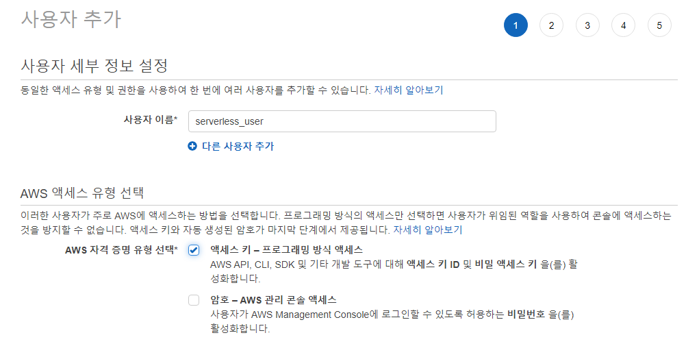 사용자 이름을 입력하고 엑세스 키 - 프로그래밍 방식 엑세스를 선택해준다