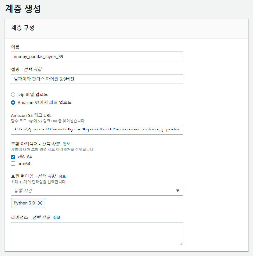 Amazon S3에서 파일 업로드하고(용량이 적으면 .zip파일 업로드 바로 해도됨) X86_64, Python3.9를 선택해서 계층 생성