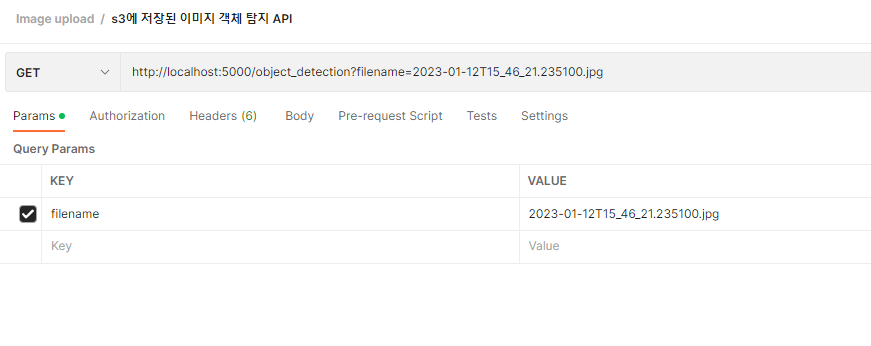 GET으로 Params에 키값을 입력하고 밸류에 S3에 저장한 파일명을 입력해준다