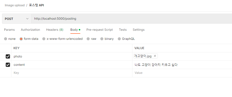 우선 포스트맨을 포스트로 셋팅하고 Body에 form-data로