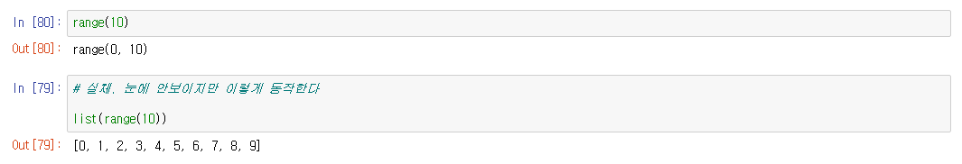 괄호 안에 숫자를 두개 적으면 시작 숫자, 마지막 숫자 -1 까지 만들어주고