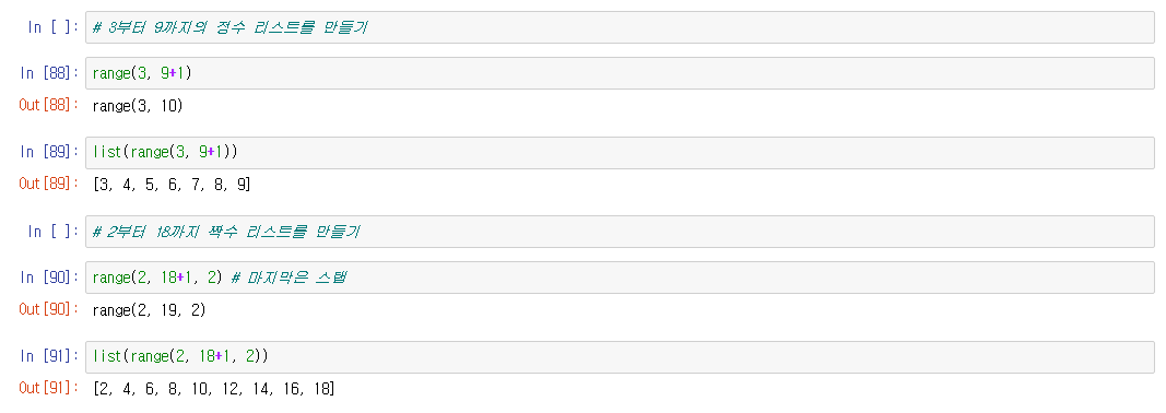 세개를 적으면 첫번째는 시작 숫자, 두번째는 마지막 숫자 -1, 세번째는 스탭으로 리스트를 만들어준다