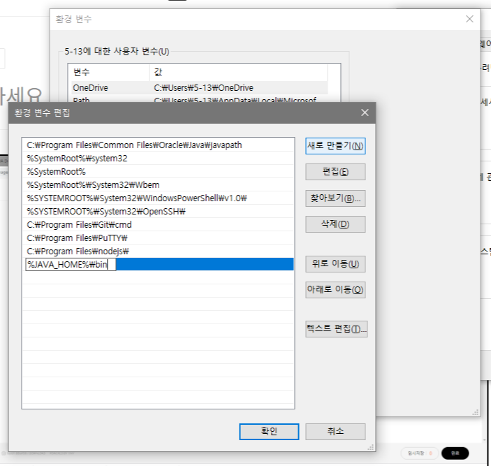 %JAVA_HOME%\bin 를 입력해 추가해준다