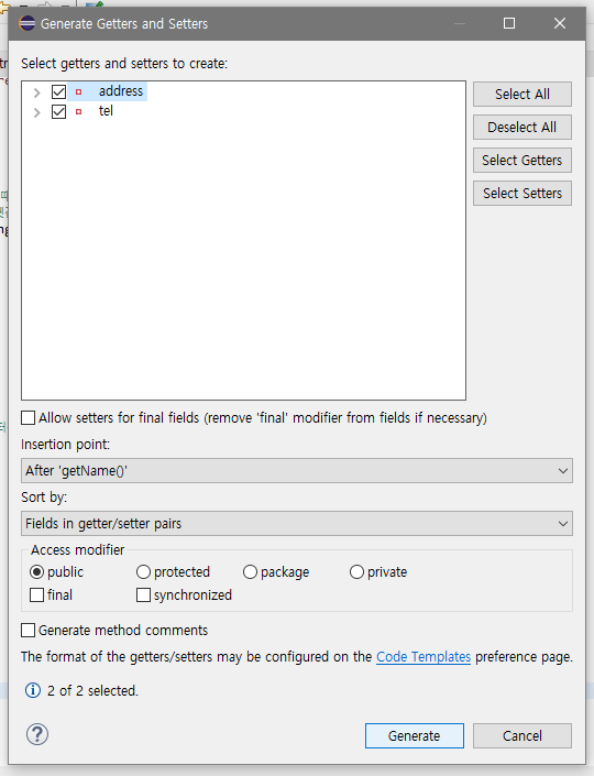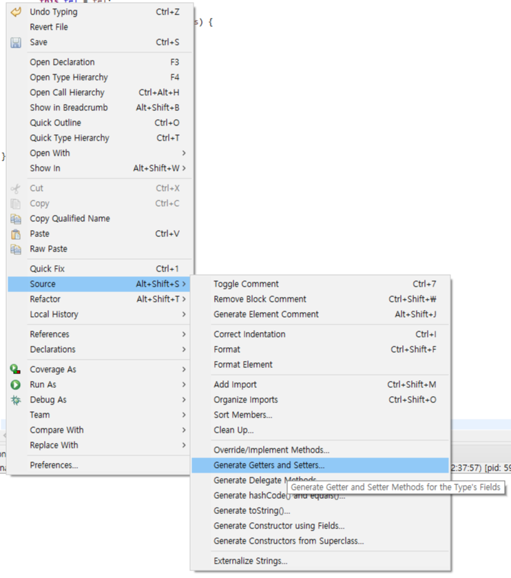 + 이클립스에서는 하나하나 타이핑하지 않고 마우스 오른쪽 눌러서 소스의 겟터엔 셋터를 클릭해 간편하게 만들 수 있다
