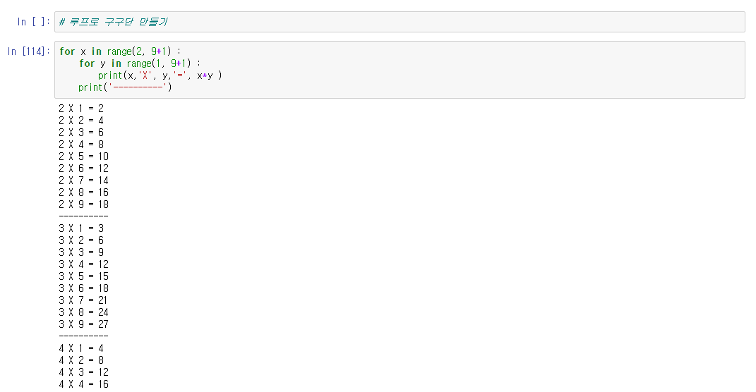 아래 예처럼 이런 중첩 반복문으로 구구단도 쉽게 만들 수 있다