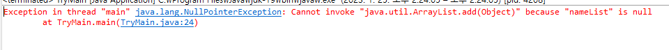 Exception in thread "main" java.lang.NullPointerException: Cannot invoke "java.util.ArrayList.add(Object)" because "nameList" is null at TryMain.main(TryMain.java:10)