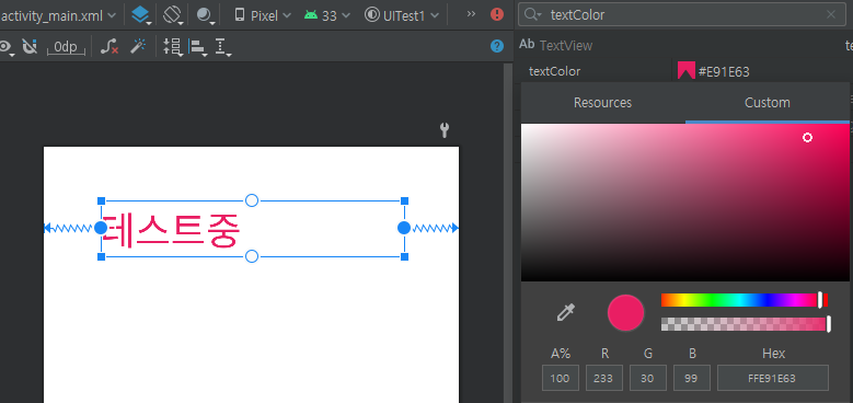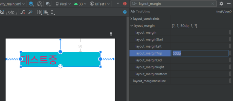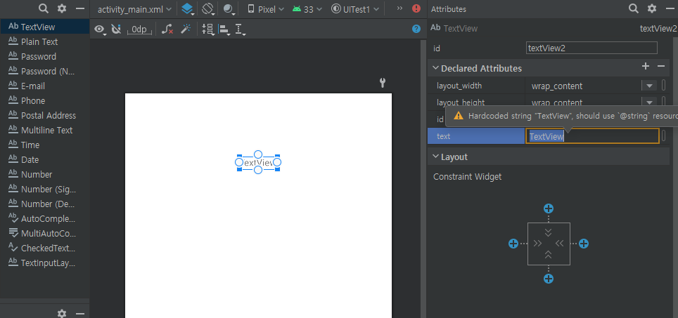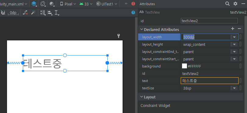 우선 TextView를 사용할 레이아웃에 끌어다 놓으면 생성되고 우측의 text로 이름을 변경해줄 수 있다