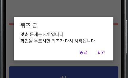 builder.setMessage("맞춘 문제는 " + count + "개 입니다\n확인을 누르시면 퀴즈가 다시 시작됩니다");