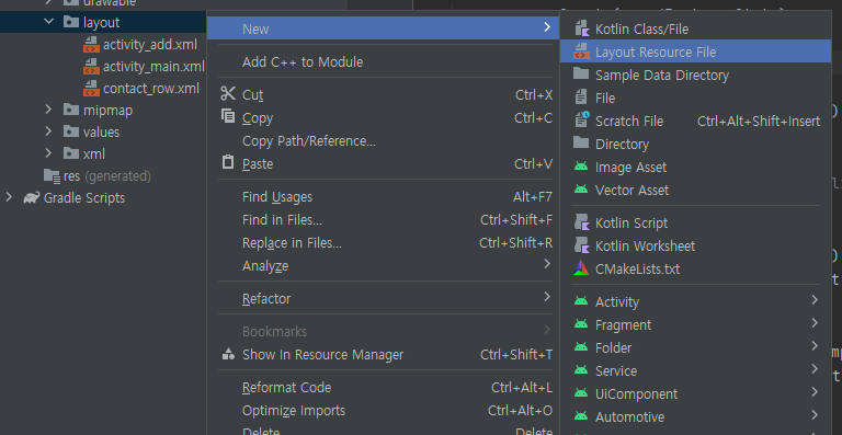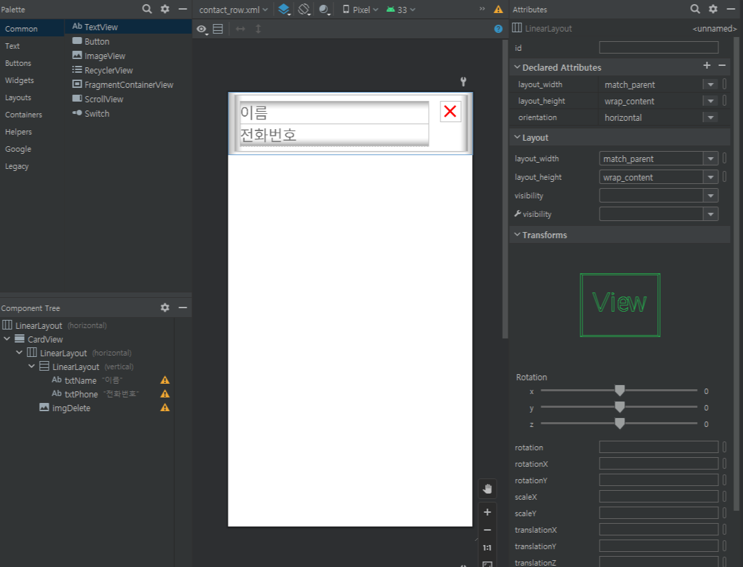 우선 하나의 행에 대한 화면개발을 먼저 한다 (파일명 contact_row, element LinearLayout로 파일 생성해줬다)