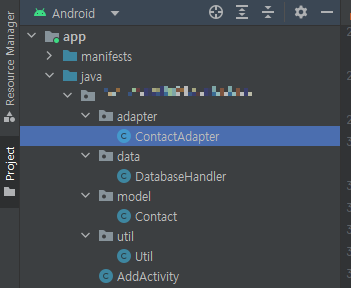 java 앱파일에 adapter 패키지를 만들어 ContactAdapter 클래스를 만들어 아래 코드를 입력해줬다