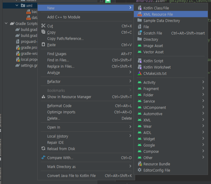 res폴더의 xml폴더에 XML Resource File을 새로 만들어준다