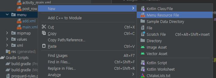 + 다른 액티비티의 액션바의 메뉴를 다르게 설정하고 싶다면 menu 우클릭 > New > Android Resource File로 만들어준다