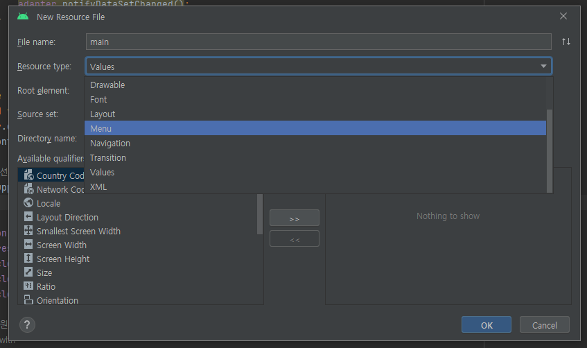 파일명은 main(메인 액티비티에서 사용할거라), Resource type은 Menu로 설정해서 생성