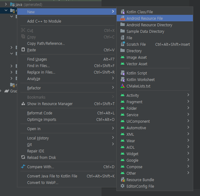 res파일에 마우스 우클릭 New > Android Resource File
