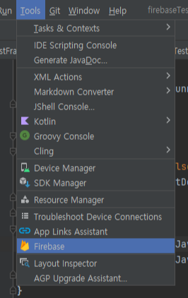 안드로이드 프로젝트로 돌아가 Tools의 파이어베이스 클릭