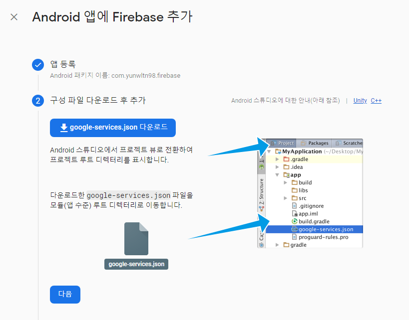 패키지 이름은 안드로이드 스튜디오 패키지이름과 동일하게 해준다