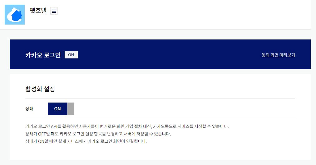 그리고 사용할 기능을 on 처리 해준다(카카오 로그인)