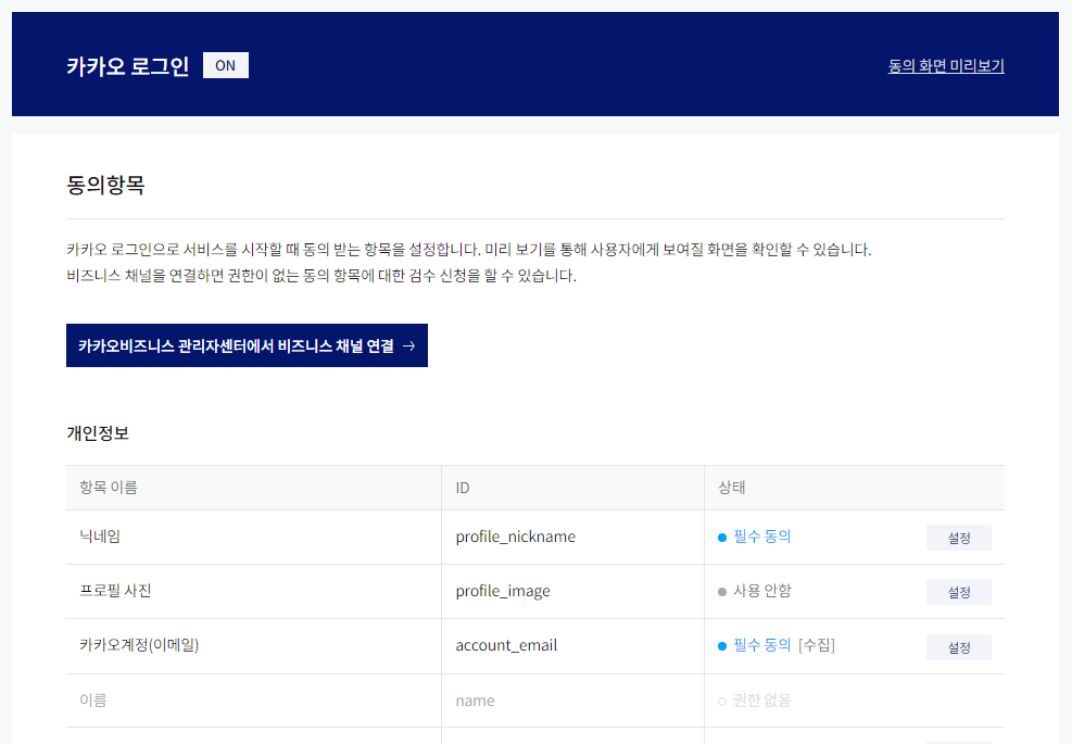 동의항목에 설정한 항목들은 유저가 카카오 로그인시에 카카오 서비스에 등록한 사용자의 정보를 가지고 올 수 있으니