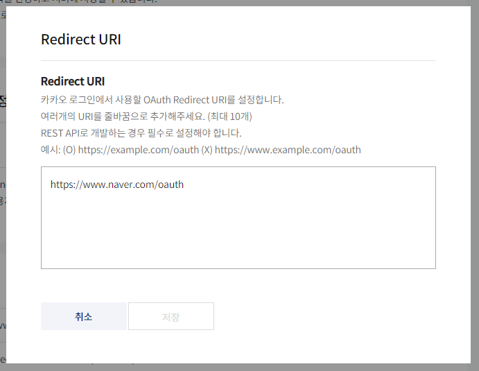 그리고 밑의 Redirect URI가 등록되어있지 않으면 카카오 로그인시 에러가 난다하니 임의로 적어준다