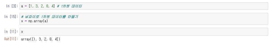 ※ 넘파이 1차원 배열은 벡터(Vector)라고도 부르고 변수로 사용할때 보통 소문자로 쓴다
