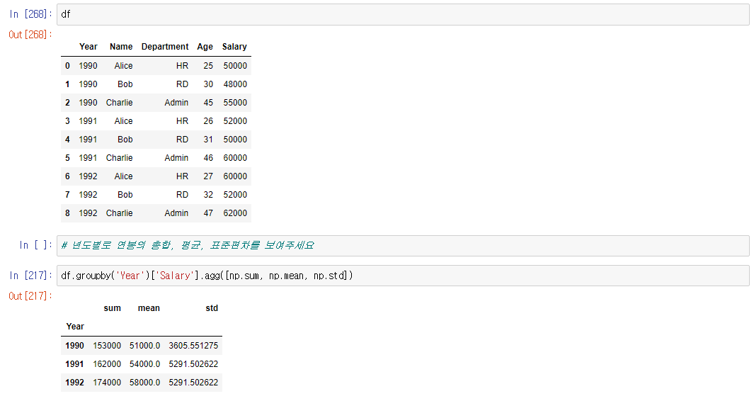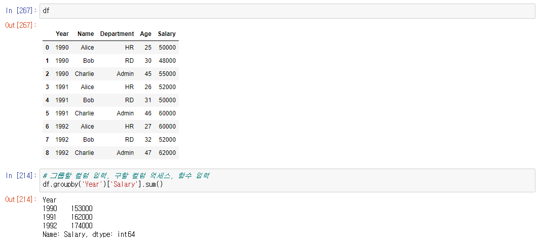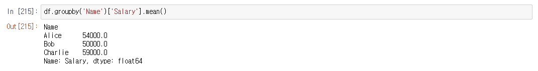 >>> df.groupby('그룹할 컬럼')['값을 구하고싶은 컬럼'].함수