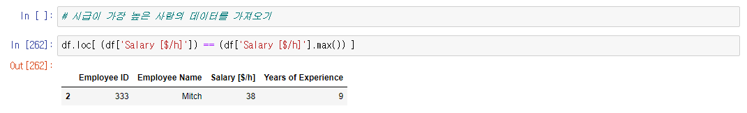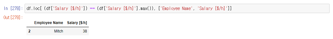 >>> df.loc[ (df['컬럼']) == (df['컬럼'].max()), ['컬럼','컬럼'] ] # 콜론(:)도 가능