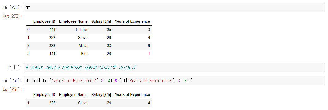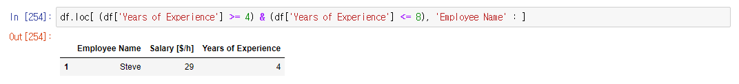 >>> df.loc[ (df['컬럼'] >= 4) & (df['컬럼'] <= 8), ['컬럼','컬럼'] ] # 콜론(:)도 가능