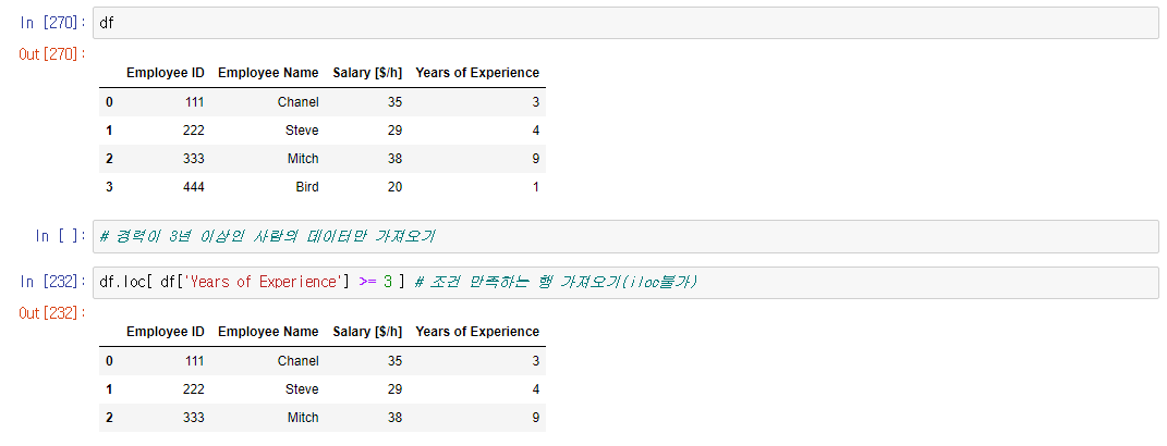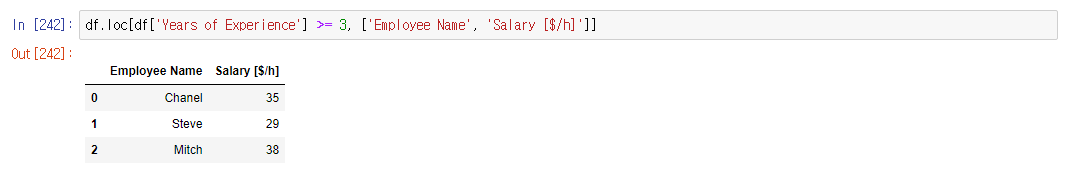 >>> df.loc[ df['컬럼a'] >= 3, ['컬럼', '컬럼'] ] # 콜론(:)도 가능