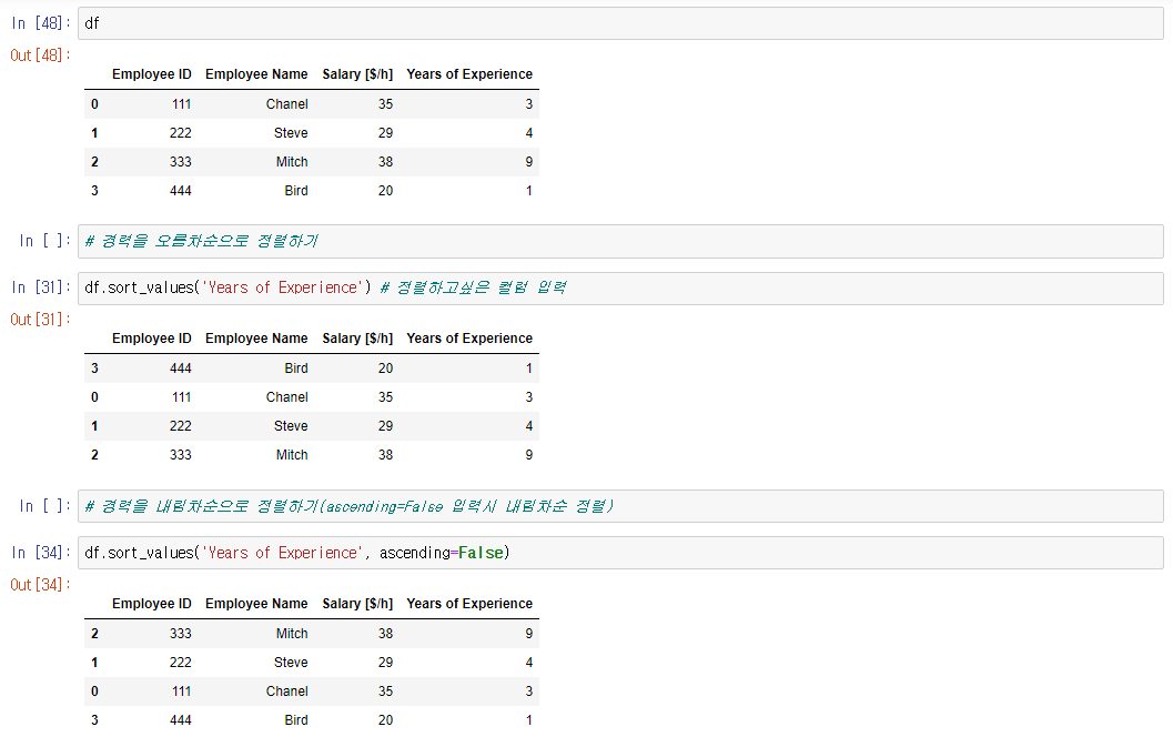 ※ 컬럼 뒤에 ascending=False 입력시 내림차순 정렬 된다(ascending=False만 입력 가능)
