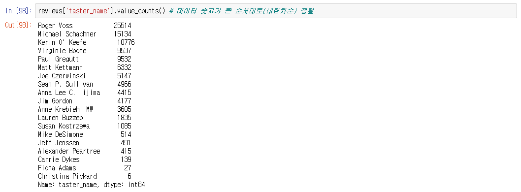 # 데이터 숫자가 큰 순서대로(내림차순) 정렬된다