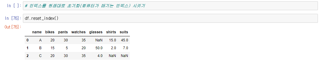df.reset_index() : 인덱스를 원래대로(컴퓨터가 매기는 인덱스) 초기화 시킨다