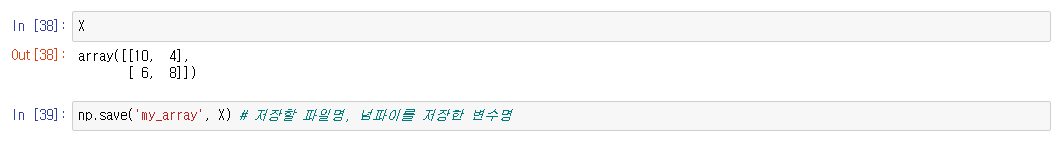 np.save(파일명, a) : 저장할 파일명, array 데이터를 저장한 변수명 입력