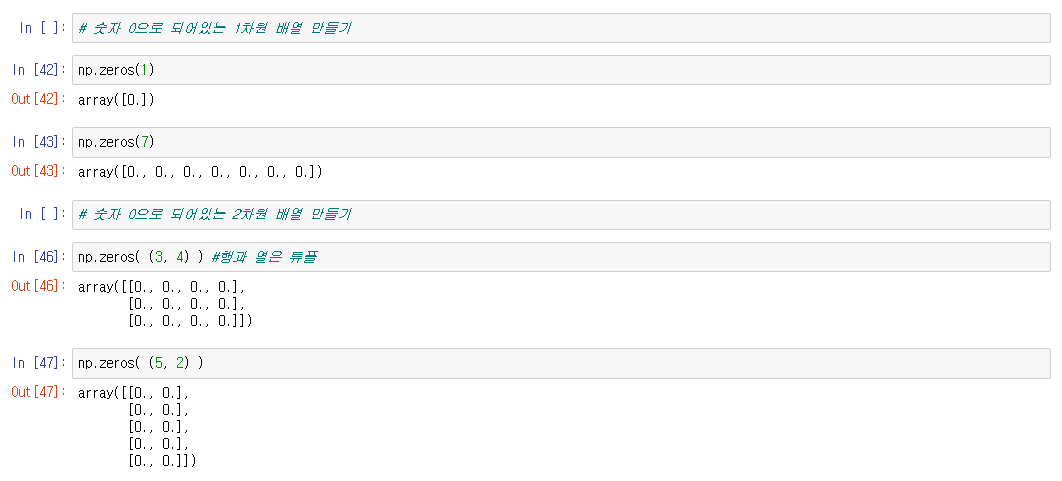 np.zeros(a) : a 값에 0을 몇개 만들지 숫자를 입력하면 해당 숫자만큼 0을 만들어준다