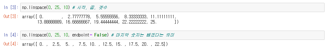 갯수 뒤에 endpoint = False 입력시 마지막 숫자는 빼겠다는 의미다