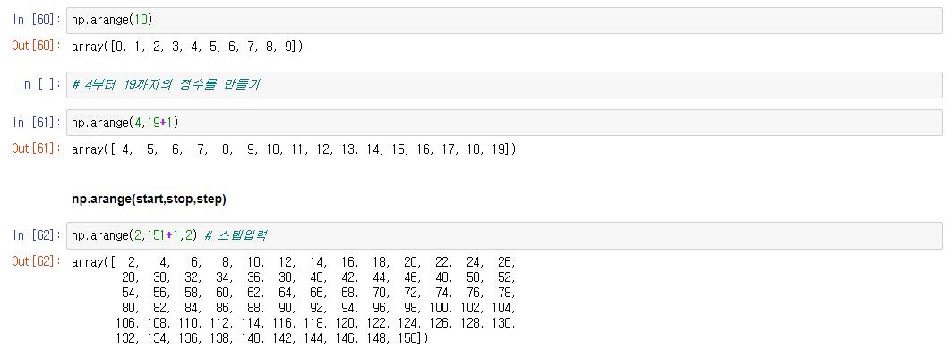 np.arange(시작수, 끝수, 스탭) : 시작수부터 끝수까지 정수형 배열을 생성한다