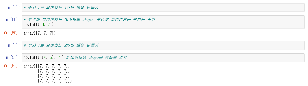 np.full(a, b) : a 만큼 b 만으로 구성된 배열 생성한다
