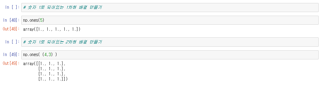 np.ones(a) : a 값에 1을 몇개 만들지 숫자를 입력하면 해당 숫자만큼 1을 만들어준다